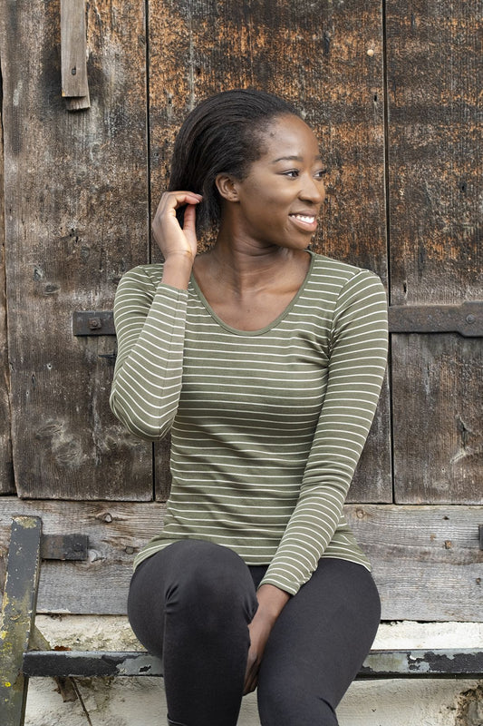 Wolle/Seide Langarm-Shirt für Damen gestreift in Olive/Natur von Engel Naturtextilien