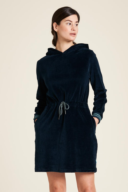 SALE: Velours-Kleid in Dunkelblau mit Kapuze von Tranquillo
