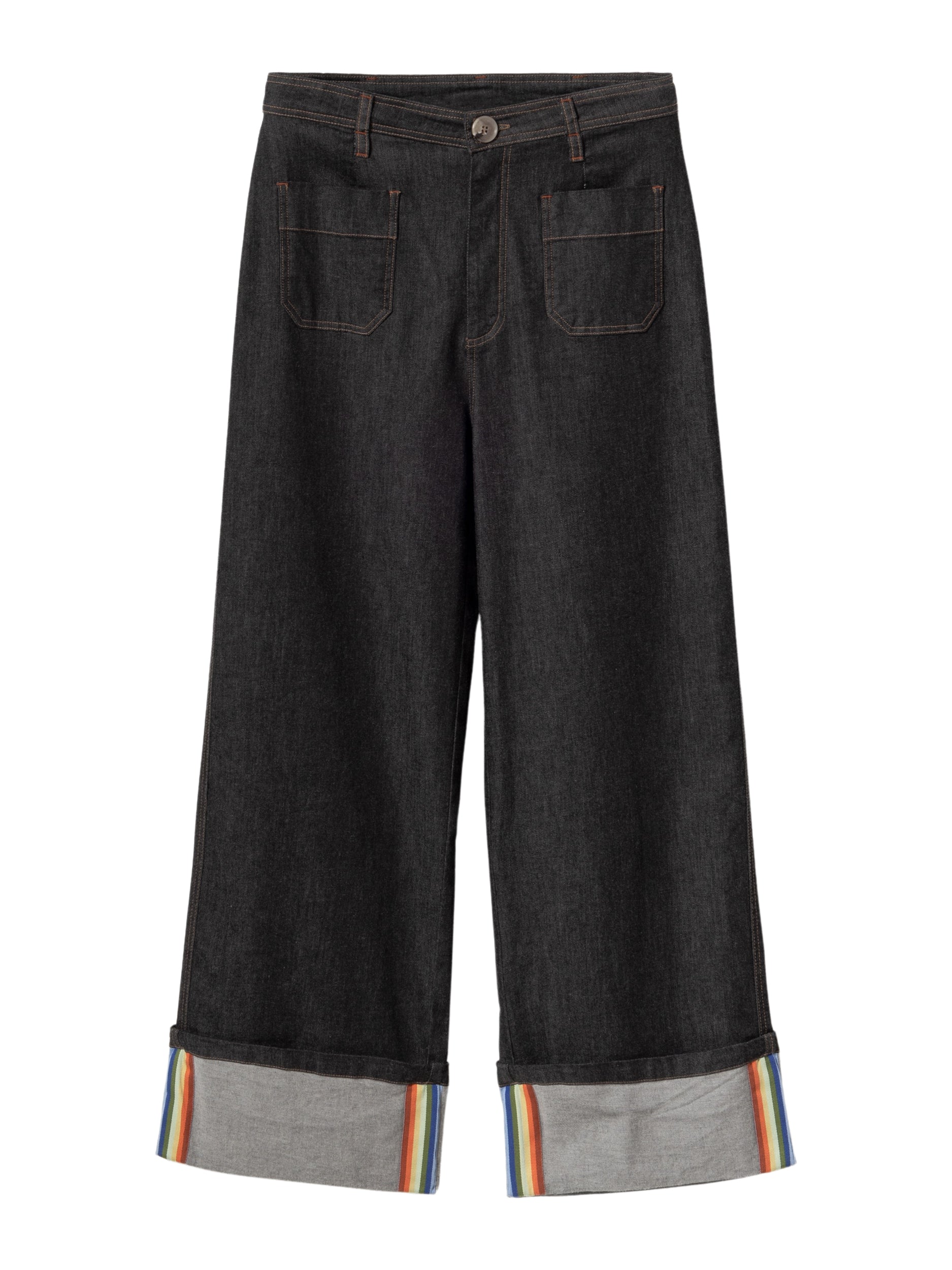 Zeitloser Denim trifft bunte Laune – für einen Look mit Überraschungseffekt. Höher geschnitten als die anderen Jeans, sitzt super, weicher, dunkler Denim mit Stretch, weites, gerades Bein, leicht verkürzte Länge, aufgesetzte Taschen vorne, hoher Saumaufschlag mit Regenbogenband. Aus 98% Bio-Baumwolle und 2% Elastan. fair und nachhaltig in der Türkei hergestellt, GOTS zertifziert. Passt super zu den Oberteilen von Mademoiselle Yéyé, Mazine und Chills&Fever.