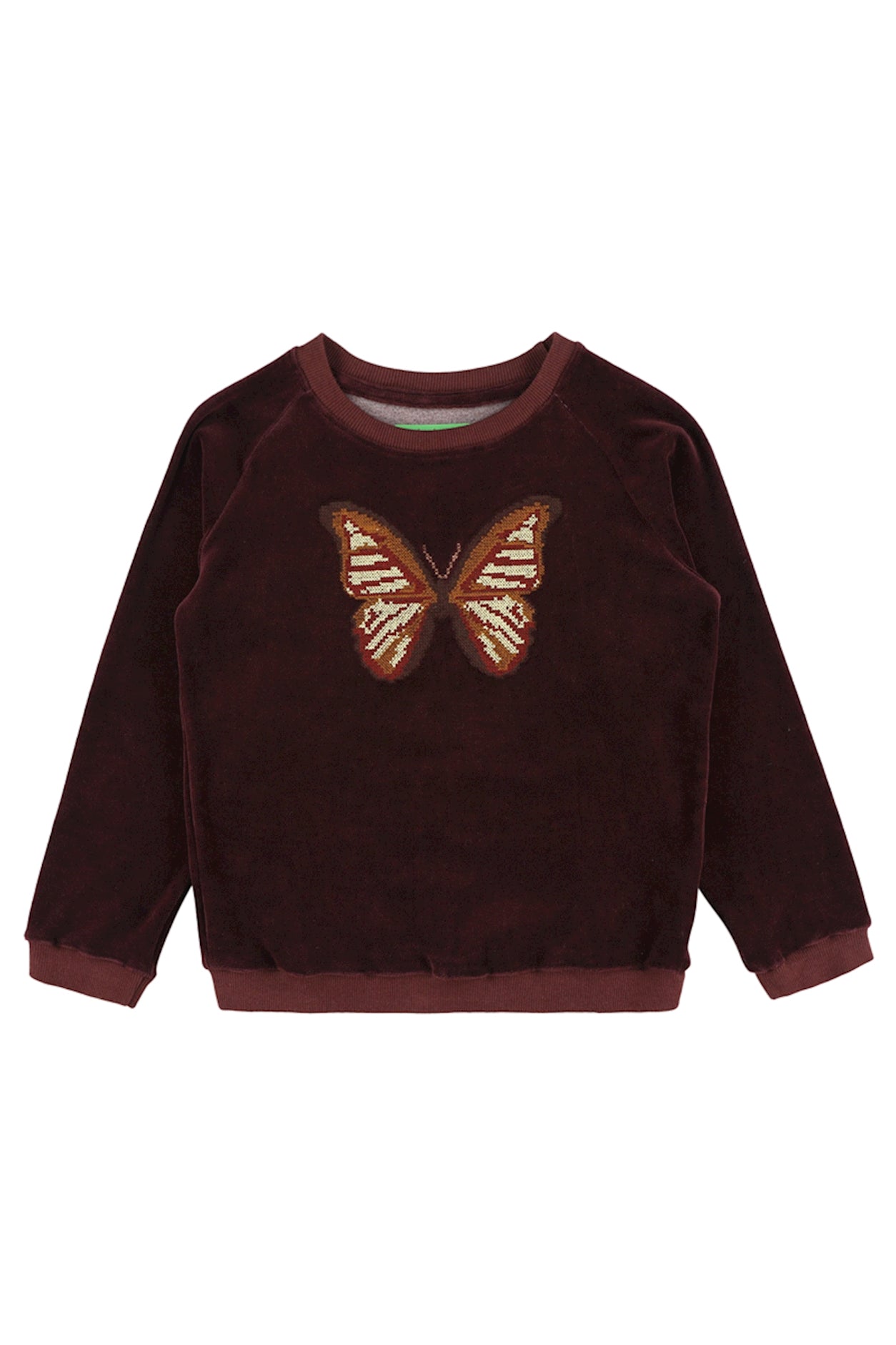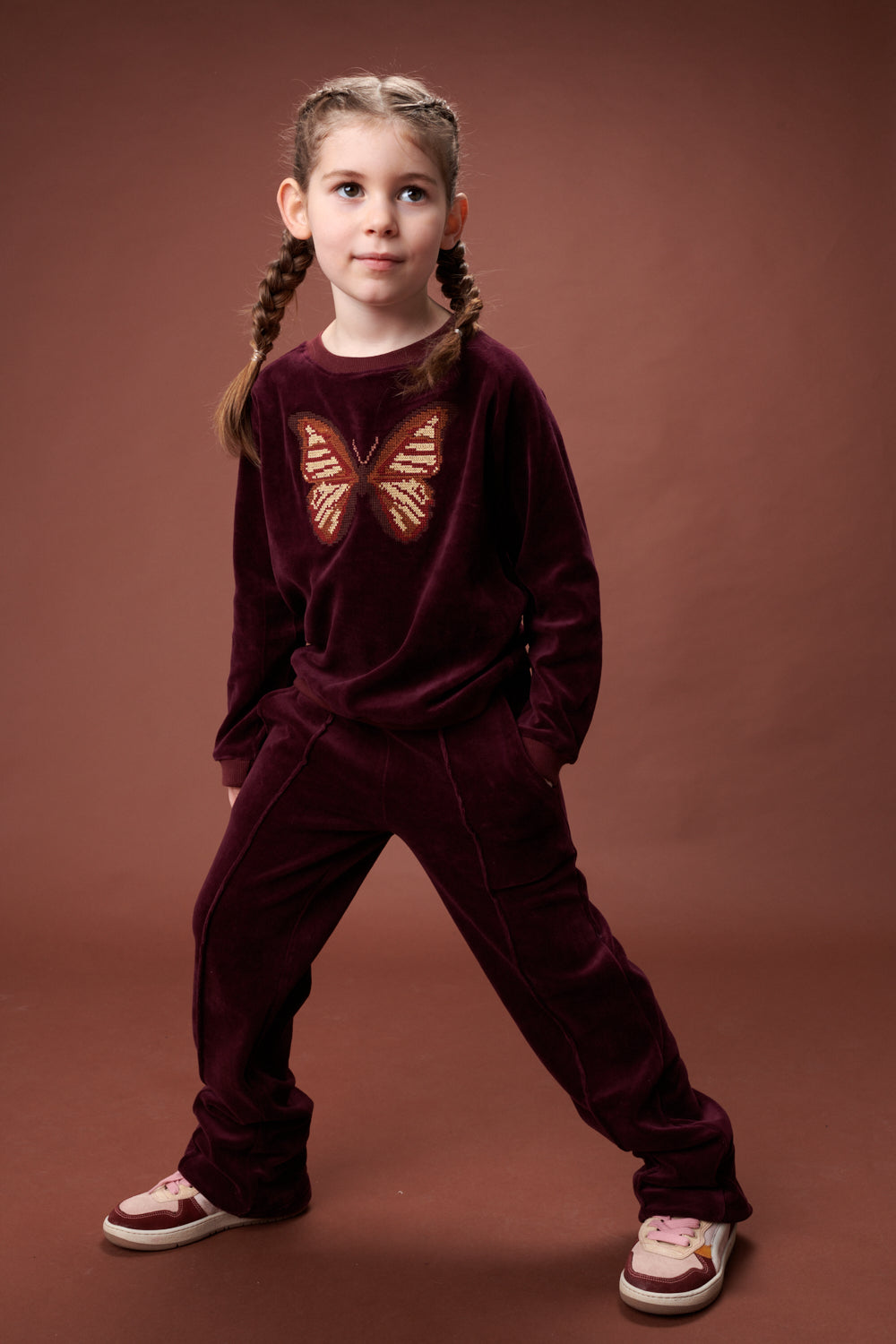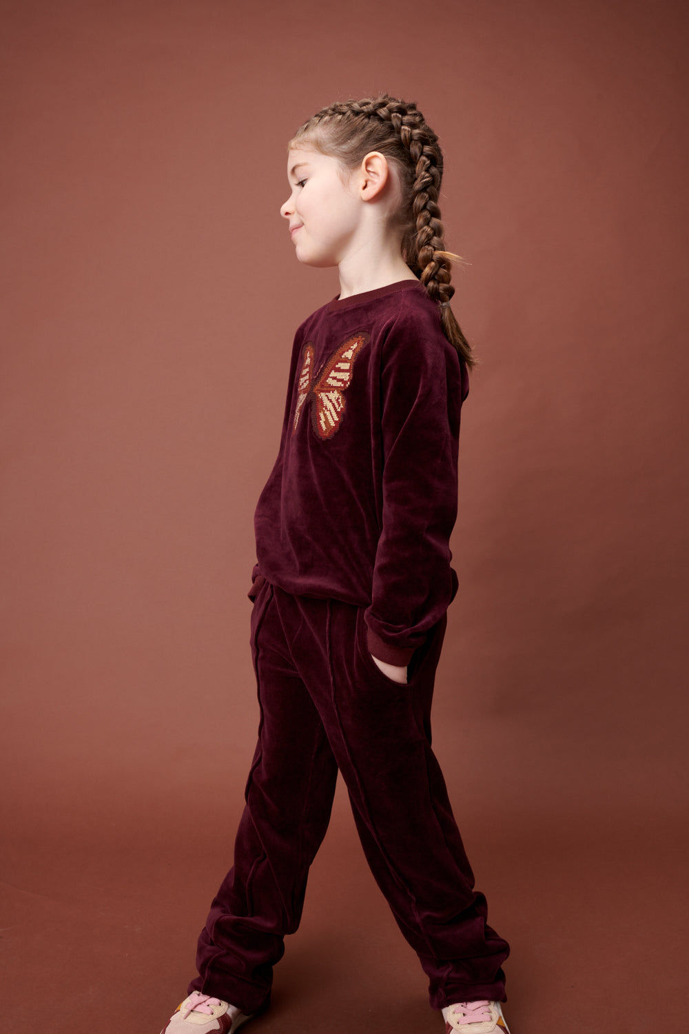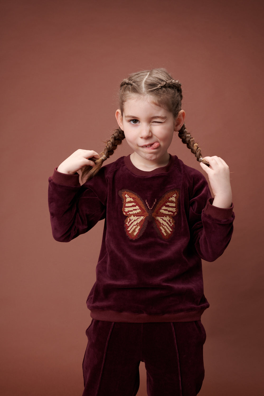 Weicher, kuschliger Velours-Pulli mit gesticktem Schmetterling von Lily Balou. Sehr angenehm und weich vom Material und vom Schnitt her. Gute Stoffdicke für Herbst/Winter. Aus 80% Biobaumwolle und 20% recycles Polyester. Fair und umweltbewusst in Indien produziert, GOTS zertifiziert. Passt sehr schön zu den neuen Hosen von Lily Balou.